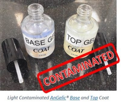 Many of our customers take the product they’ve purchased and move it into containers of their own for easier, more functional use. This helps keep product in storage sealed for longer periods of time, lessens the chance that something may be left open and is a great idea provided appropriate measures are taken to remove the risk of compromising the product. The new containers should be clean, dust-free and able to safely hold and preserve the product. Products like AnGelic® Eternal Base Coat and AnGelic® Almighty Top Coat are light sensitive – that means that they react when exposed to different lights. When these are poured out of their original 16-oz. black plastic container they are susceptible to curing even under the regular lights in the salon. If they’re put into clear polish bottles, or any other container that is light-permeable it is expected that they will cure even if the cap is on and sealed (as shown in the image). Light sensitive products need to be stored in black glass or black plastic containers.