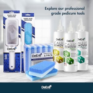 Remover: Apply Callus Remover Gel and then use DeEnti Pumice Stones to scrub off excess skin.
