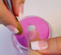 Note: Some technicians prefer scooping powder from the container and dumping it over the nail instead of “dipping” a finger into their powder.