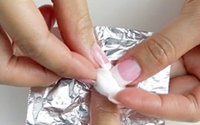 2. Place cotton balls saturated in 100% acetone on the nail and wrap with aluminum foil. Remove the wraps after 10-15 minutes.