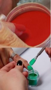 Note: Some technicians prefer scooping powder from the container and dumping it over the nail instead of “dipping” a finger into their powder.