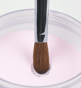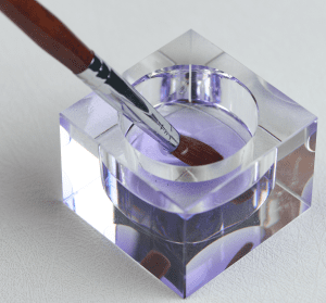 Prep Your Brush: Dip your brush completely into your dappen dish of monomer, making sure to fully saturate the bristles. Make sure air bubbles stop coming out from the brush, and take care to not draw them onto the brush when taking it out.