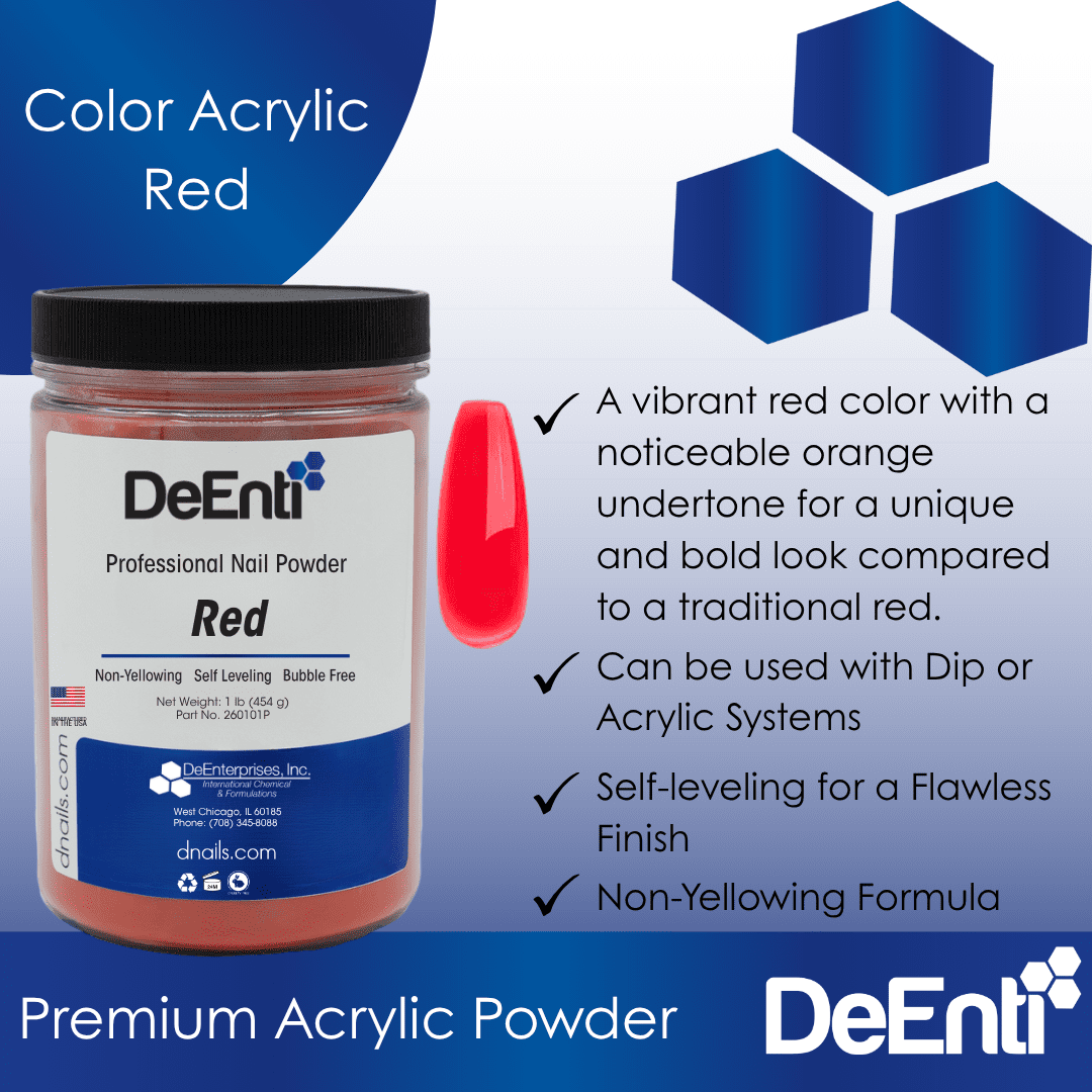 Our Red Acrylic powder offers a bright red color with a hint of orange.