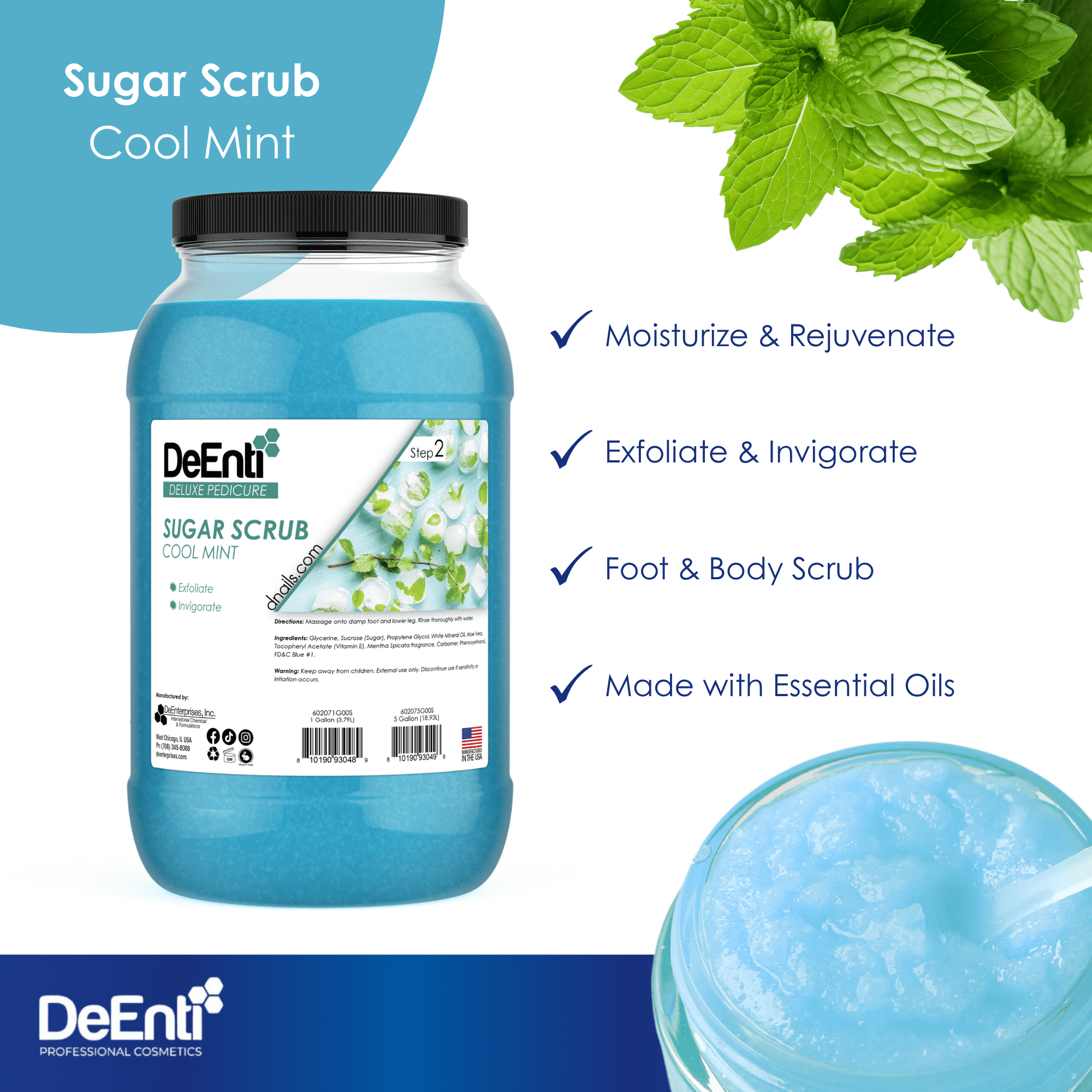 • A 1-gallon clear jar of light blue DeEnti Cool Mint Sugar Scrub, an exfoliating product for a cooling pedicure, shown with mint leaves and ice cubes. Cool Mint Sugar Scrub – 1 Gallon